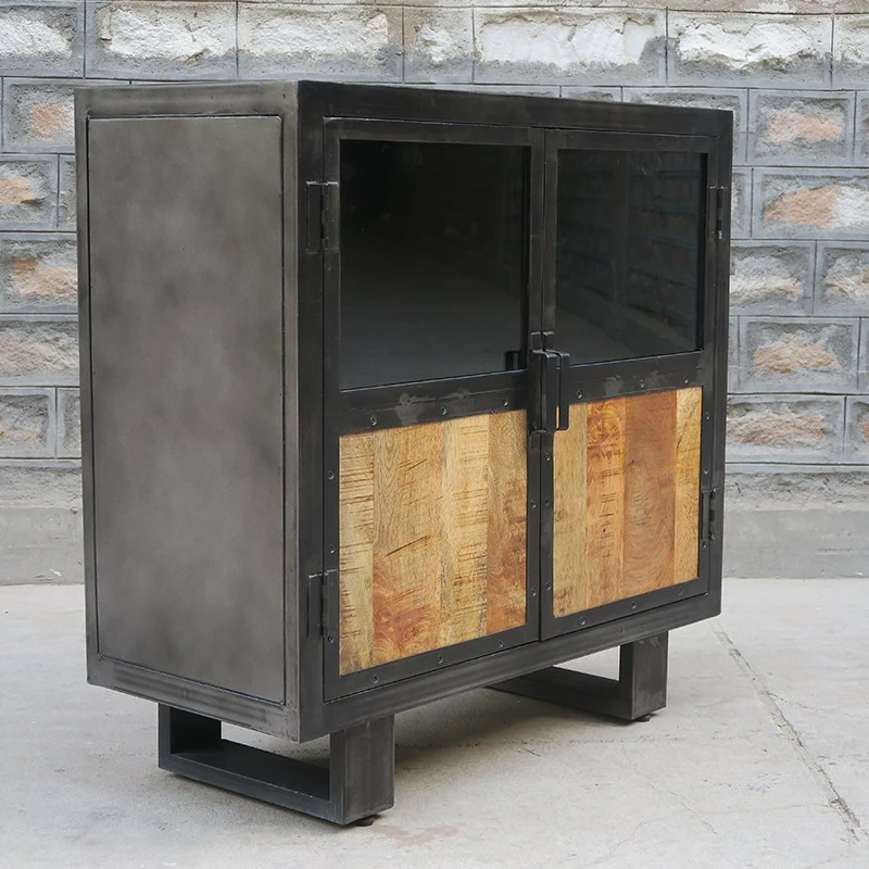 Buffet petit modèle de la collection Jodhpur en métal et bois. Ce buffet dispose de deux portes demi-vitrées avec étagère intérieure pour plus de rangement. Son style résolument moderne apportera une touche industrielle à votre intérieur.