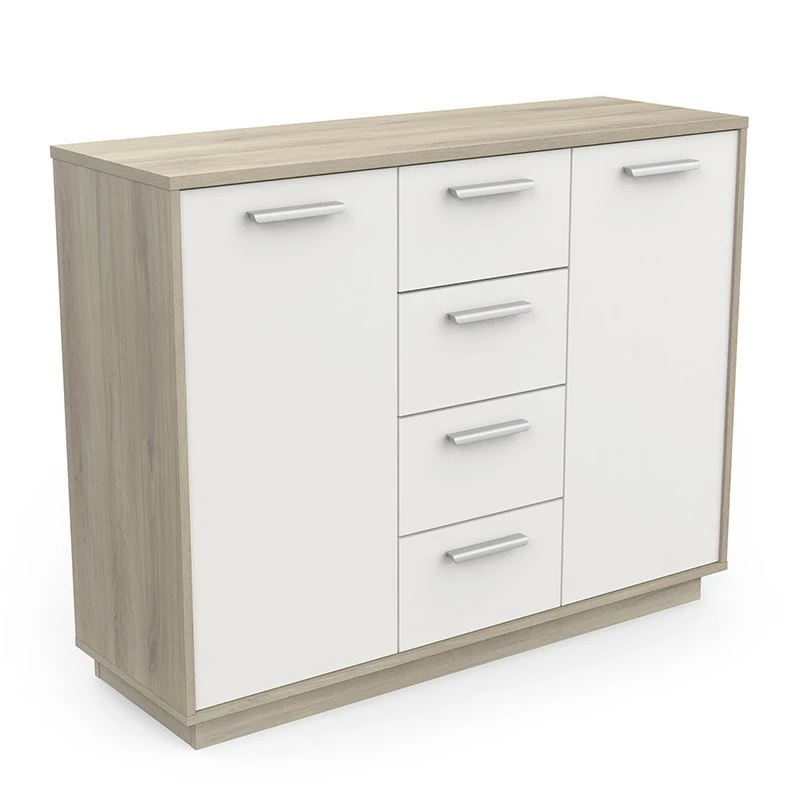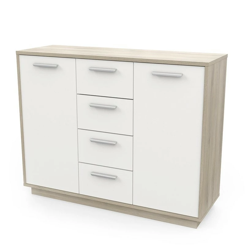 Avec son style épuré, le buffet bas 2 portes 4 tiroirs Léo s’intègre facilement dans un intérieur.
