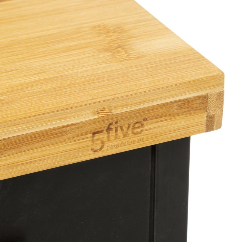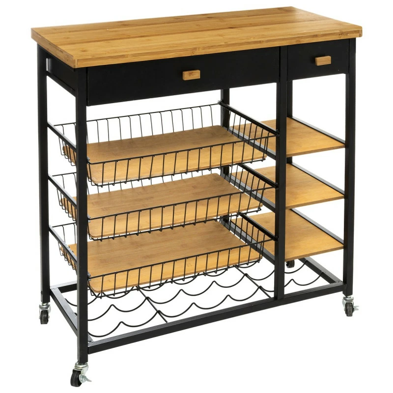 En bambou et métal, elle propose de nombreux rangements : 2 tiroirs + 3 paniers en métal + 3 étagères + 1 support à bouteilles.