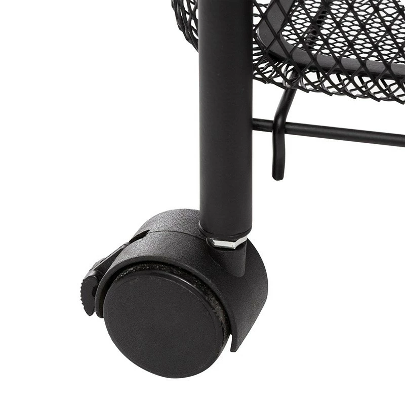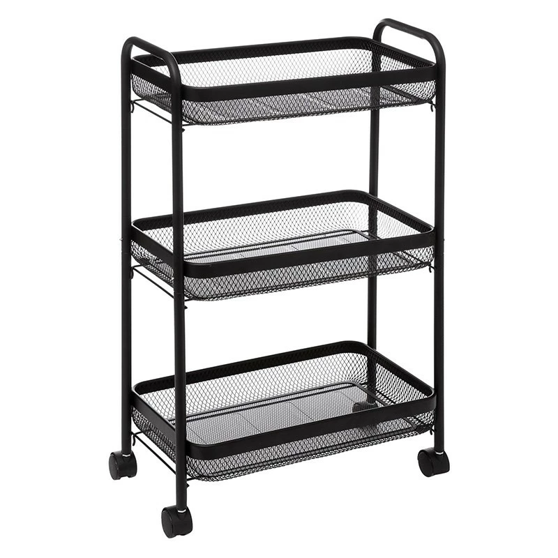 Desserte 3 niveaux entièrement en métal noir sur roulettes.
