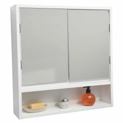 Ce meuble sous lavabo en bambou et MDF dispose d’une étagère intérieure.