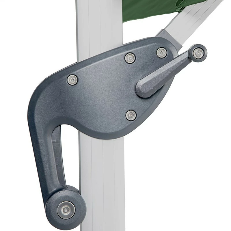 Type d’ouverture par manivelle. Système d’aération de la toile pour une meilleure prise au vent. Parasol traité contre la décoloration, déperlant et protection des UV : UPF50.