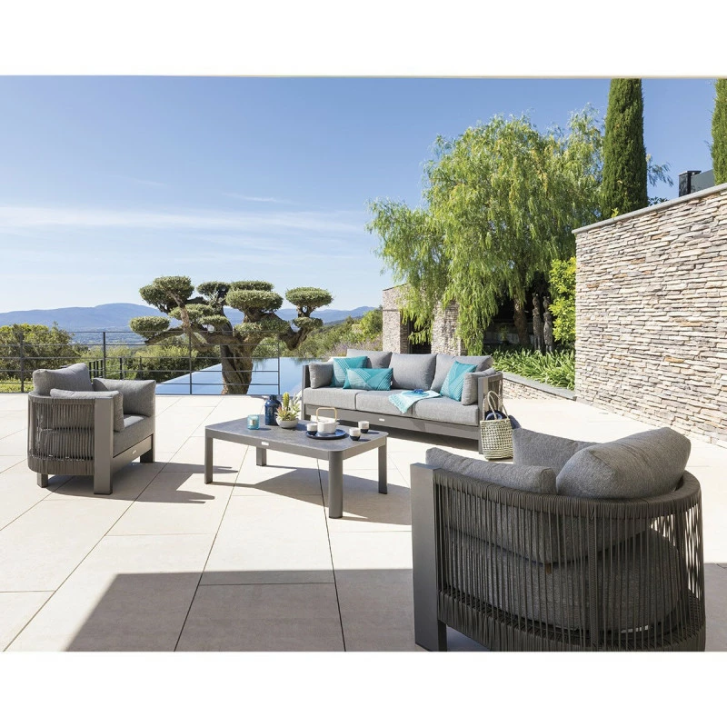 Très résistant, ce salon dispose d’une structure en aluminium traité époxy antirouille. Les coussins d’assise en oléfine (230 g/m²) sont conçus pour résister à la décoloration et aux pluies fines. Ils sont déhoussables pour un entretien facile. Enfin, les cordes sont en acrylique et le plateau en résine plastique.