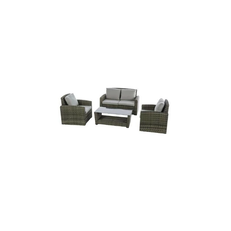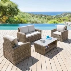 Salon de jardin 4 places Polynésia de la marque Hespéride. Le charme de la résine tressée apportera de la chaleur à votre terrasse.