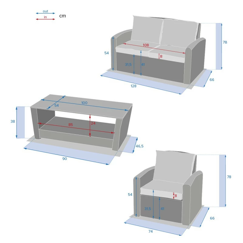 Ce salon dispose de 4 éléments : 1 canapé deux places 128x66x78 cm, 2 fauteuils une place 74x66x78 cm ainsi qu’une table basse 100x54x38 cm.