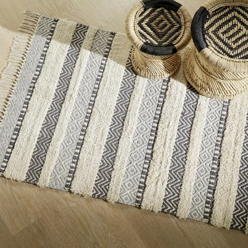 Tapis rectangulaire à franges style ethnique de la marque Atmosphera. Les différents motifs en relief ainsi que les franges de ce tapis apportent un esprit bohème à un intérieur. Parfait dans une chambre, un salon ou même un bureau, sa taille et ses tons doux vous permettront de l’associer partout.